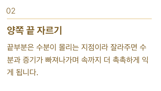 그다음, 양쪽 끝을 살짝 잘라주는 게 핵심이에요. 끝부분은 수분이 몰리는 지점이라 잘라주면 수분과 증기가 빠져나가며 속까지 더 촉촉하게 익게 됩니다.