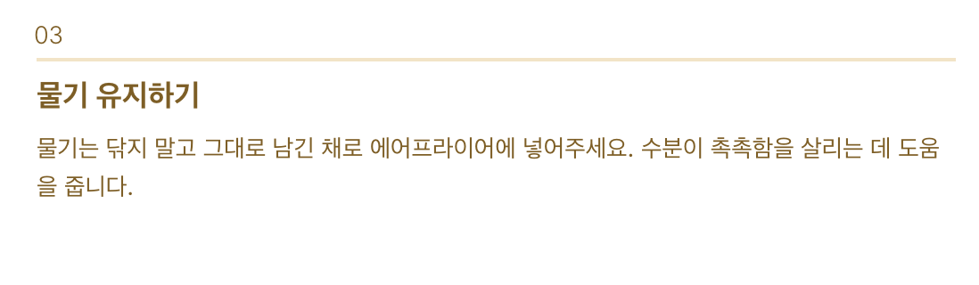 물기는 닦지 말고 그대로 남긴 채로 에어프라이어에 넣어주세요. 수분이 촉촉함을 살리는 데 도움을 줍니다.