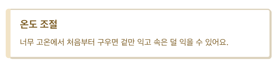 - 너무 고온에서 처음부터 구우면 겉만 익고 속은 덜 익을 수 있어요.