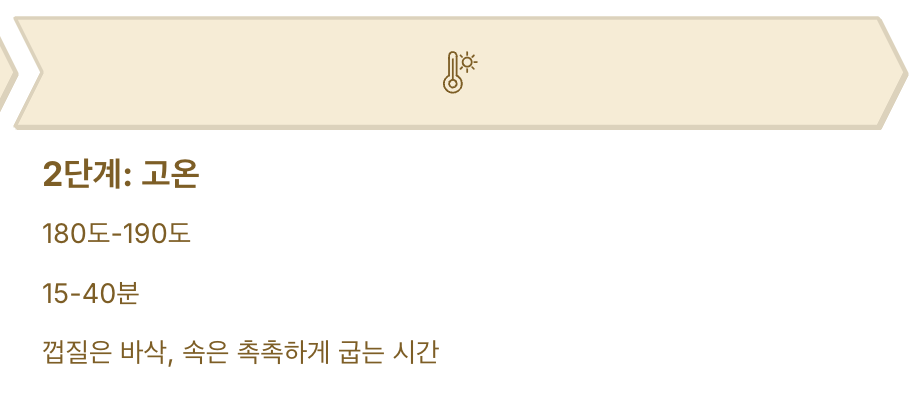| 2단계 | 180도~190도 | 15~40분 | 껍질은 바삭, 속은 촉촉하게 굽는 시간 |