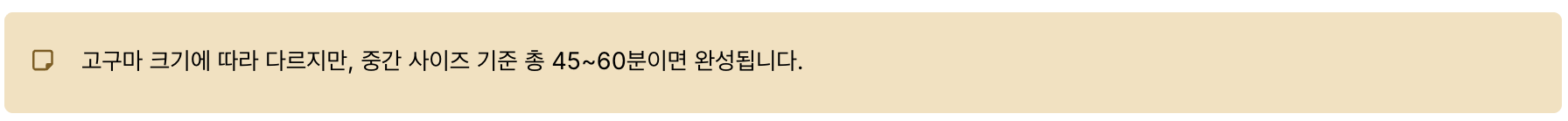 고구마 크기에 따라 다르지만, 중간 사이즈 기준 총 45~60분이면 완성됩니다.