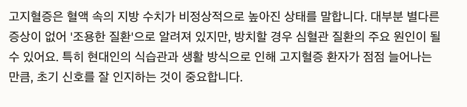 고지혈증은 혈액 속의 지방 수치가 비정상적으로 높아진 상태를 말합니다. 대부분 별다른 증상이 없어 '조용한 질환'으로 알려져 있지만, 방치할 경우 심혈관 질환의 주요 원인이 될 수 있어요. 특히 현대인의 식습관과 생활 방식으로 인해 고지혈증 환자가 점점 늘어나는 만큼, 초기 신호를 잘 인지하는 것이 중요합니다. 오늘은 눈으로 확인하기 어려운 고지혈증 증상에 대해 자세히 알아보겠습니다.