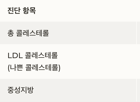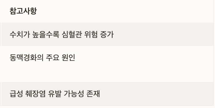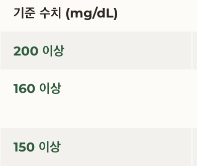 | 총 콜레스테롤 | 200 이상 (또는 240 이상) | 수치가 높을수록 심혈관 위험 증가 |