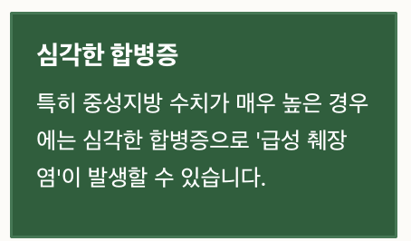 | 중성지방 | 150 이상 | 급성 췌장염 유발 가능성 존재 |