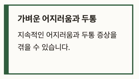 가벼운 어지러움과 두통 증상을 겪을 수 있습니다.