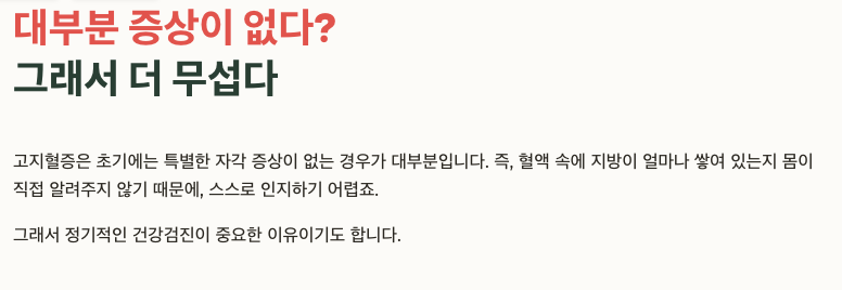 즉, 혈액 속에 지방이 얼마나 쌓여 있는지 몸이 직접 알려주지 않기 때문에, 스스로 인지하기 어렵죠.