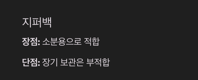 | 지퍼백 | 소분용으로 적합 | 장기 보관은 부적합 |