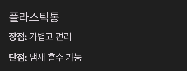 | 플라스틱통 | 가볍고 편리 | 냄새 흡수 가능 |