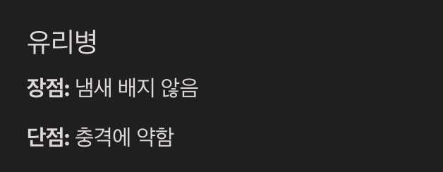 | 유리병 | 냄새 배지 않음 | 충격에 약함 |