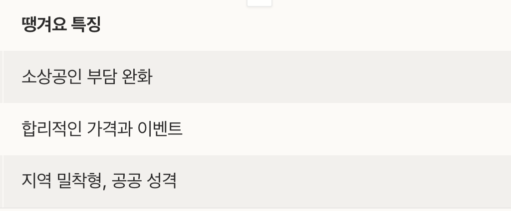 민간 플랫폼이 전국 단위 경쟁에 집중한다면, 땡겨요는 지역 밀착형 서비스라는 점이 다릅니다. 특정 지역 주민들이 자주 찾는 매장과 연결되어 있어 지역 상권을 직접적으로 살릴 수 있는 구조입니다.