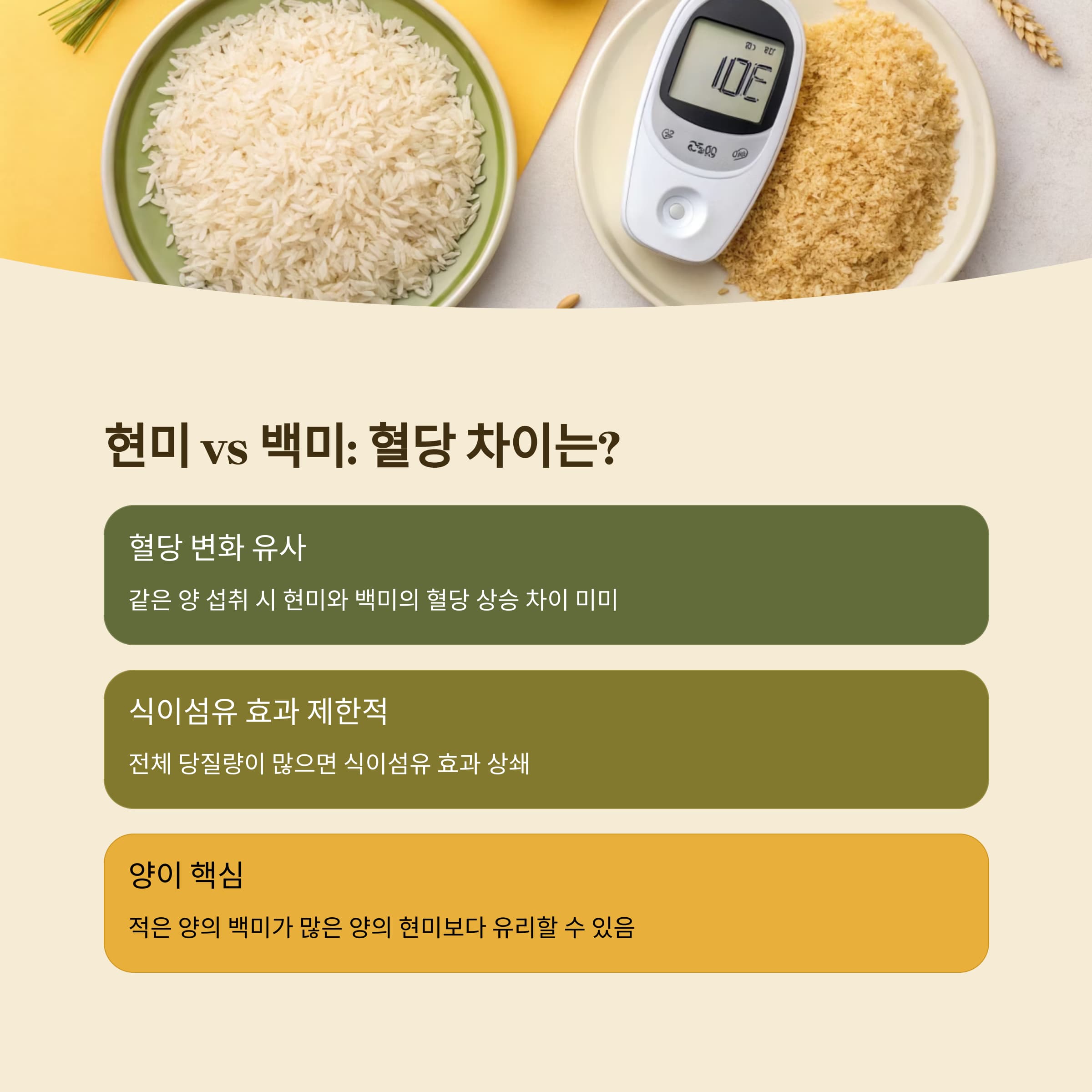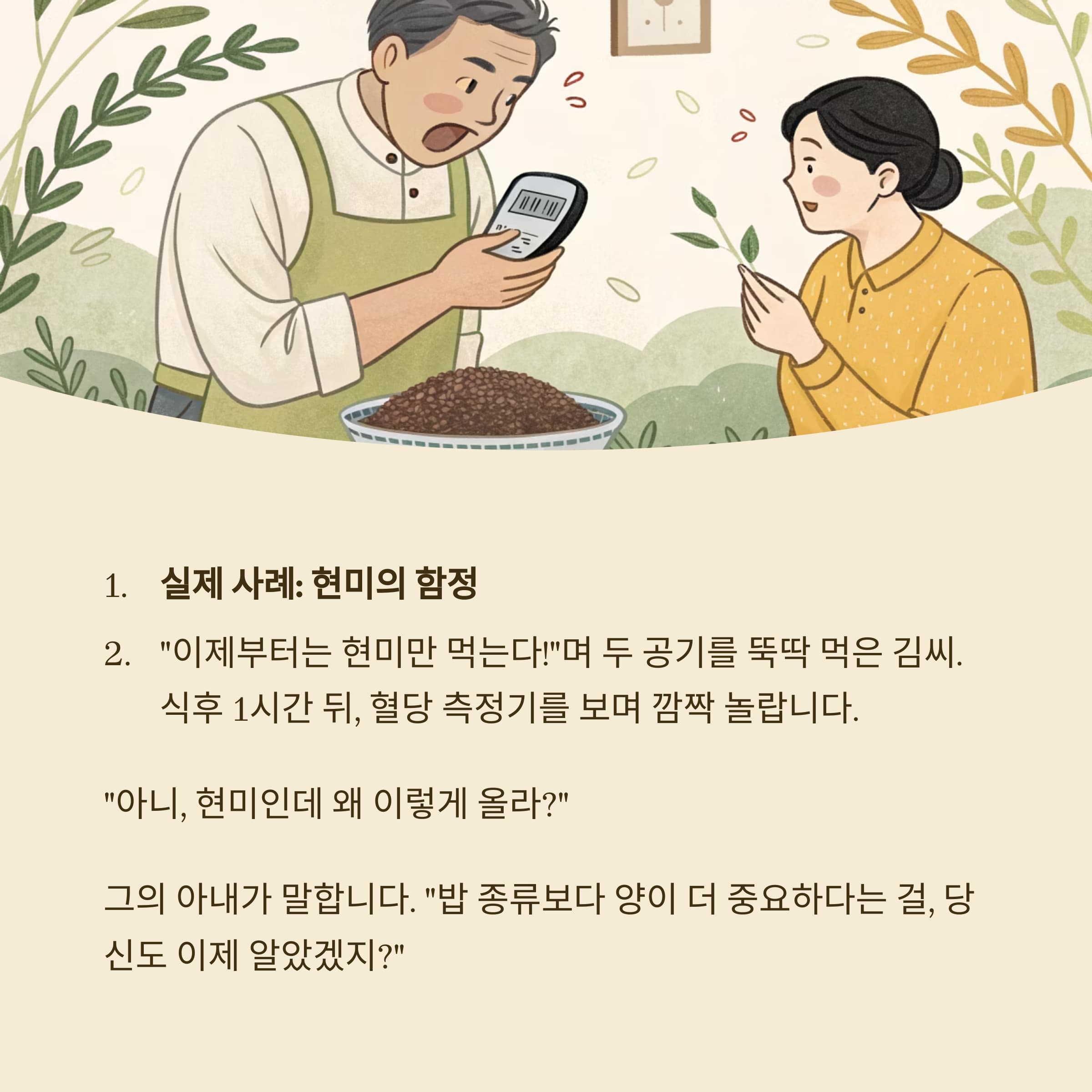적은 양의 백미는 많은 현미보다 혈당에 더 유리할 수 있다는 점, 기억하세요.