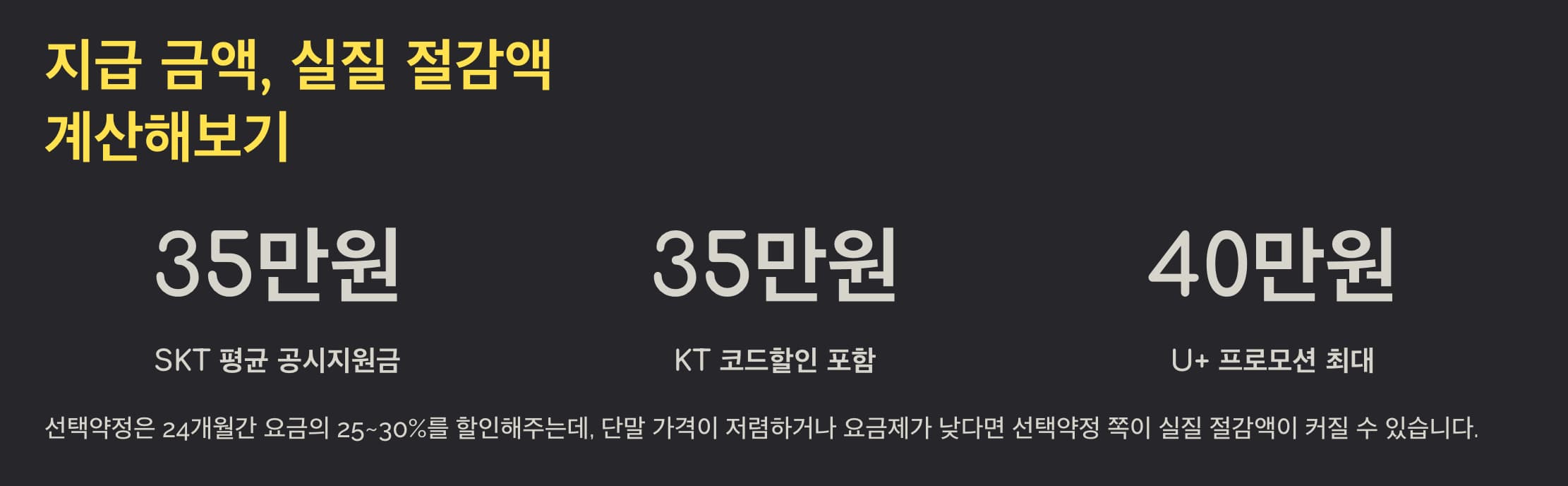 KT는 코드할인 포함 약 35만 원, U+는 프로모션 시기에 따라 최대 40만 원까지 지원됩니다.