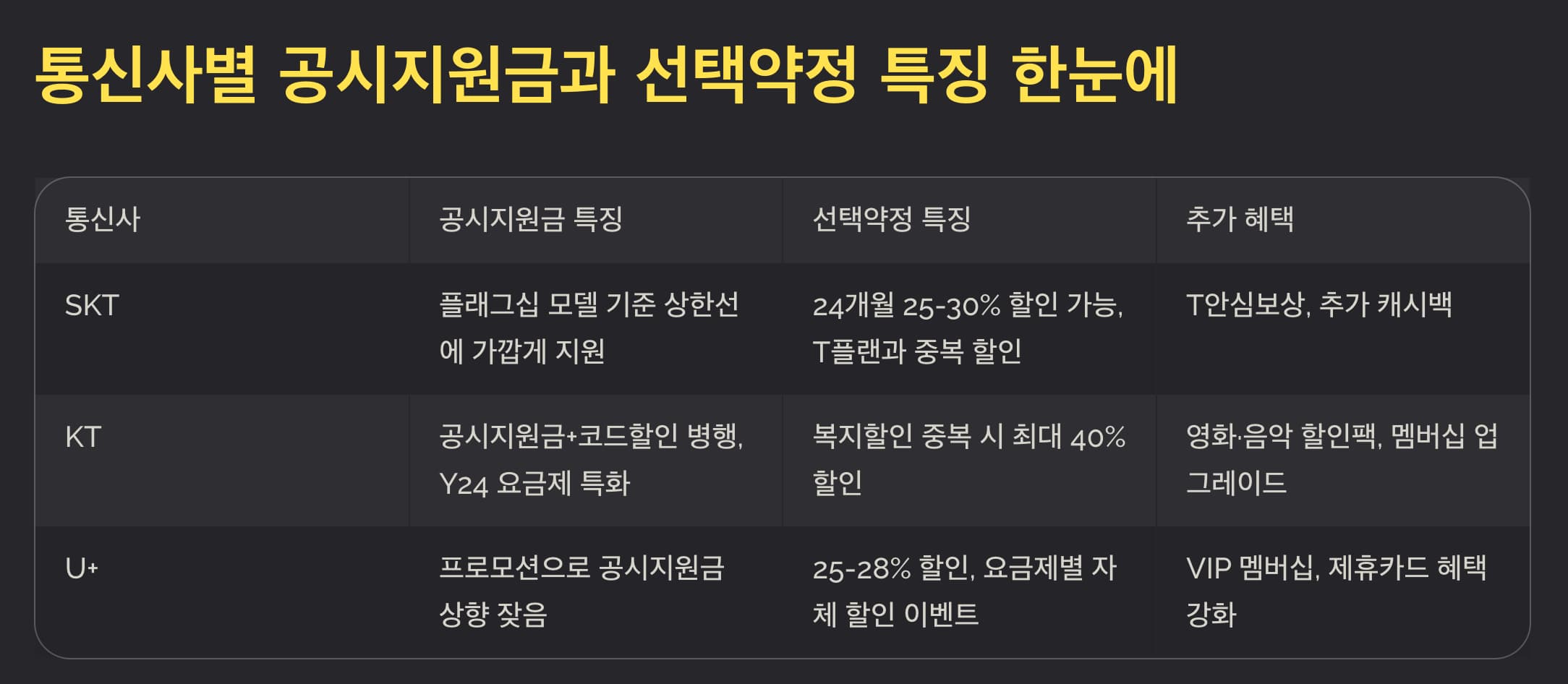 | U+ | 프로모션으로 공시지원금 상향 잦음 | 25~28% 할인, 요금제별 자체 할인 이벤트 | VIP 멤버십, 제휴카드 혜택 강화 |