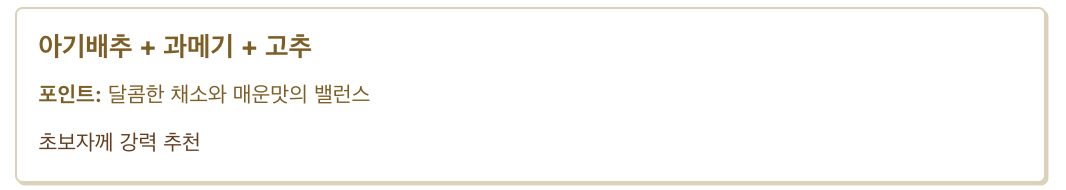 | 아기배추 + 과메기 + 고추 | 달콤한 채소와 매운맛의 밸런스 | 초보자 추천 |