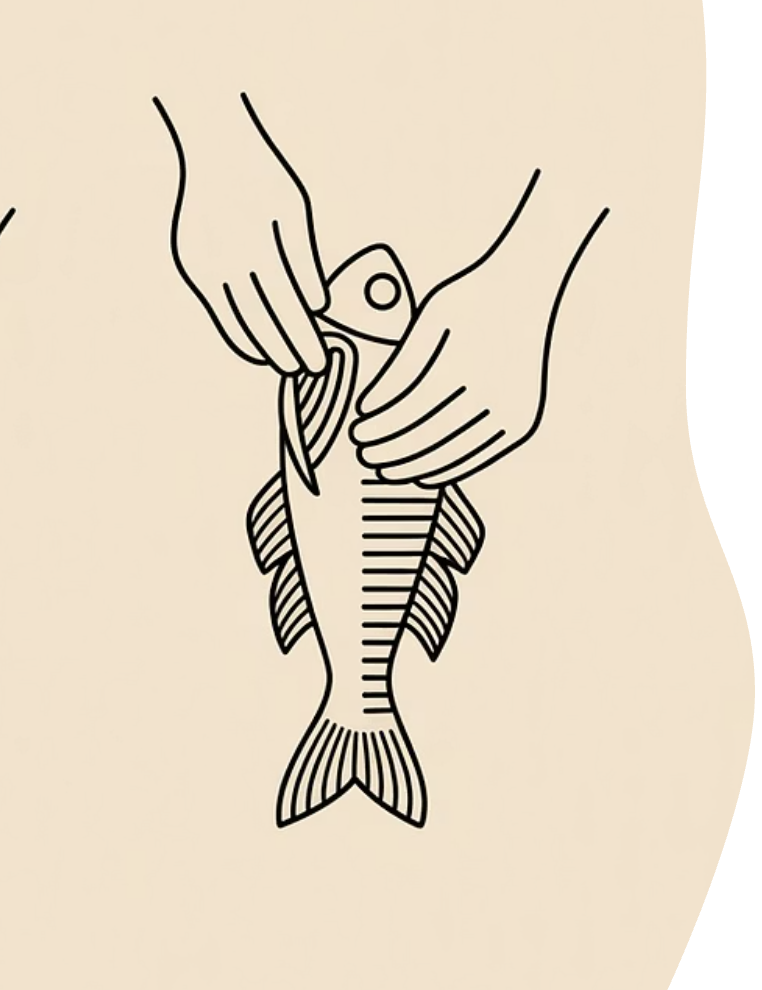 과메기를 펼쳐보면 얇게 붙은 껍질이 있습니다. 이 껍질이 비린내의 주범인데요, 먹기 전 반드시 머리 부분에서부터 껍질을 천천히 벗겨주세요. 이렇게만 해도 비릿한 향이 한층 줄어들어 과메기의 본연의 맛을 더 잘 느낄 수 있습니다.