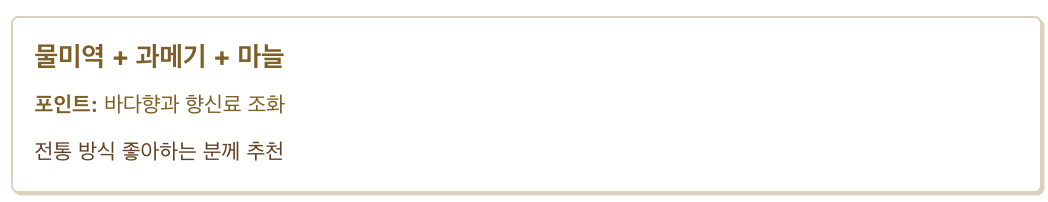 | 물미역 + 과메기 + 마늘 | 바다향과 향신료 조화 | 전통 방식 좋아하는 분 |