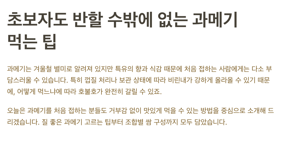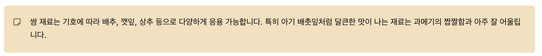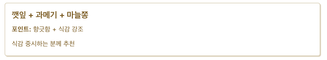 | 깻잎 + 과메기 + 마늘쫑 | 향긋함 + 식감 강조 | 식감 중시하는 분 |