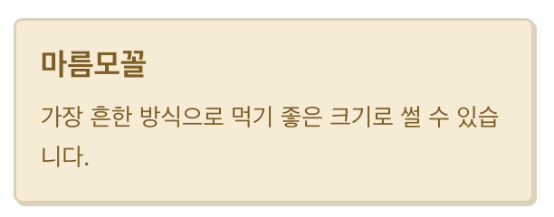 | 과메기 | 껍질 제거 후 한입 크기로 썰기 |