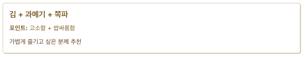 | 김 + 과메기 + 쪽파 | 고소함 + 쌉싸름함 | 가볍게 즐기고 싶은 분 |