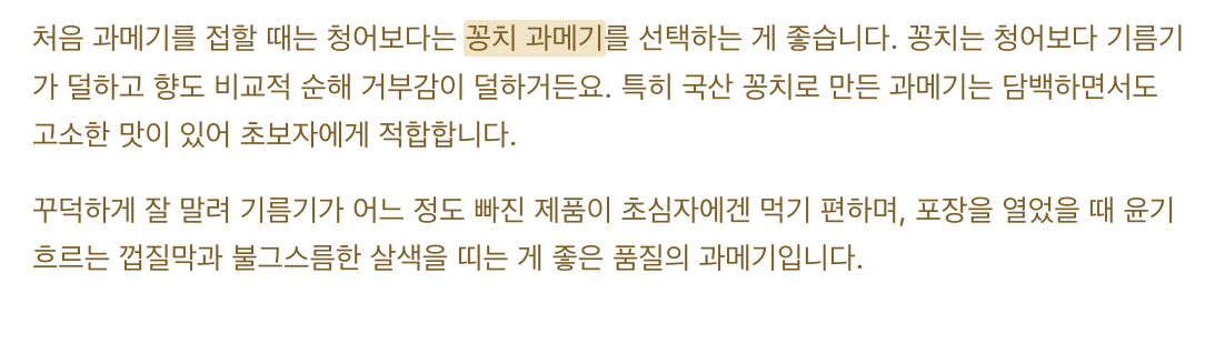 꾸덕하게 잘 말려 기름기가 어느 정도 빠진 제품이 초심자에겐 먹기 편하며, 포장을 열었을 때 윤기 흐르는 껍질막과 불그스름한 살색을 띠는 게 좋은 품질의 과메기입니다.