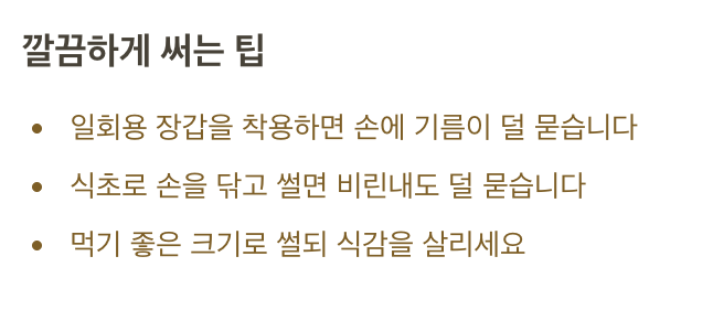 이때 손에 기름이 묻는 걸 줄이고 싶다면 일회용 장갑을 착용하거나, 식초로 손을 닦고 썰면 비린내도 덜 묻습니다.
