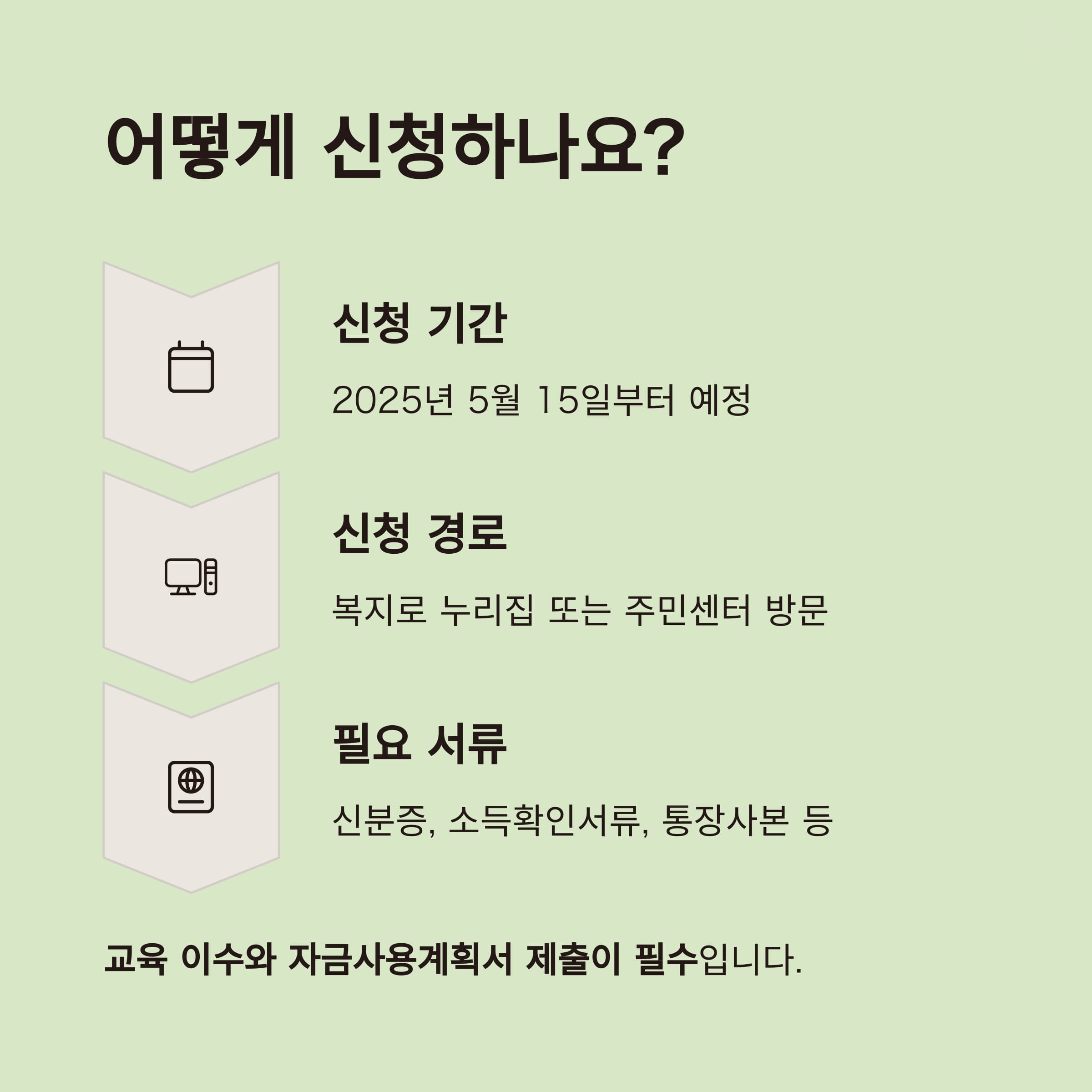 교육 이수와 자금사용계획서 제출이 필수이며, 이후 지원금 지급이 확정됩니다.