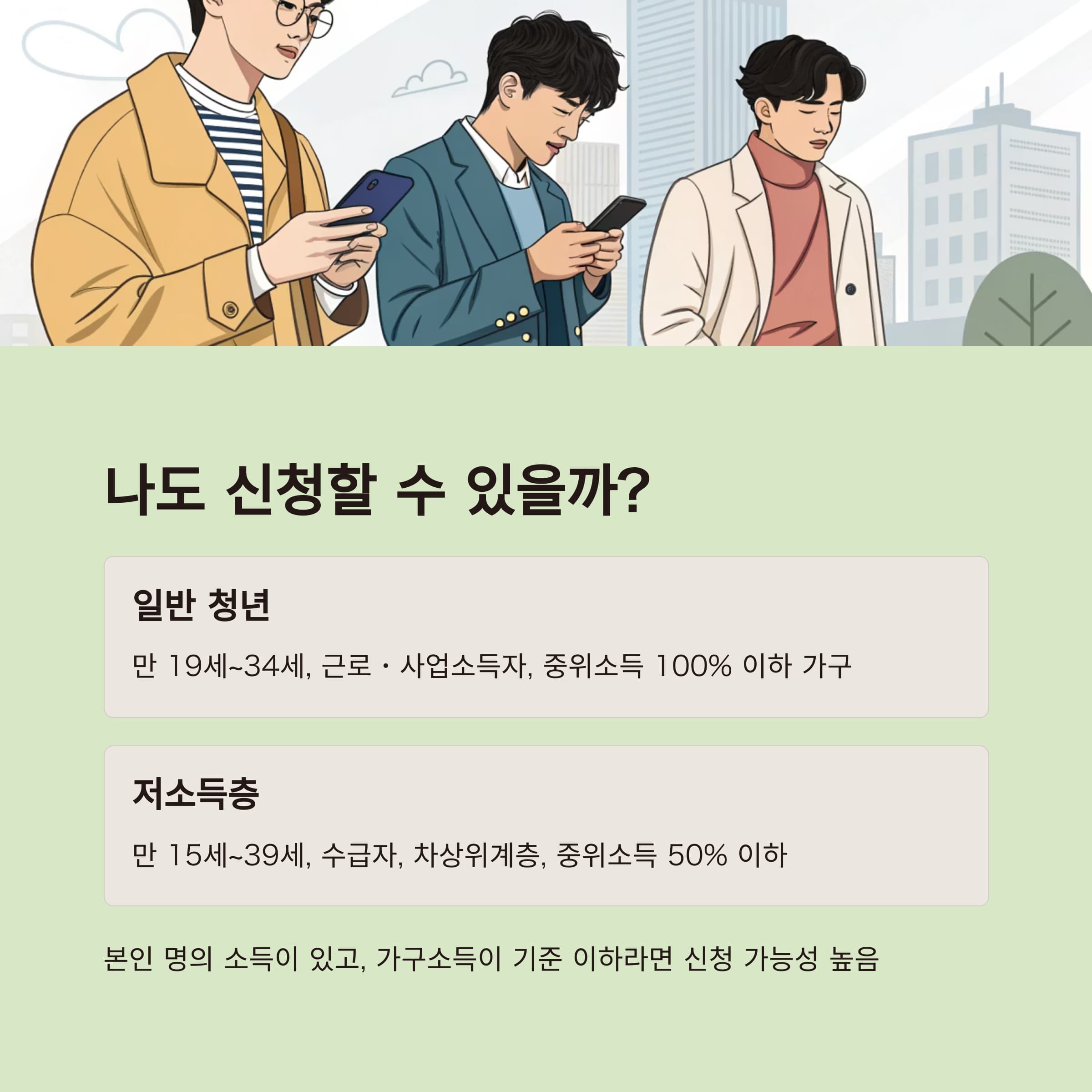 | 일반 청년 | 만 19세~34세 | 근로·사업소득자, 중위소득 100% 이하 가구 |