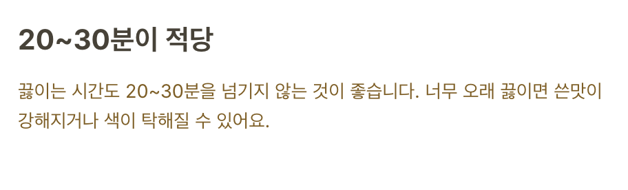 너무 오래 끓이면 쓴맛이 강해지거나 색이 탁해질 수 있어요.