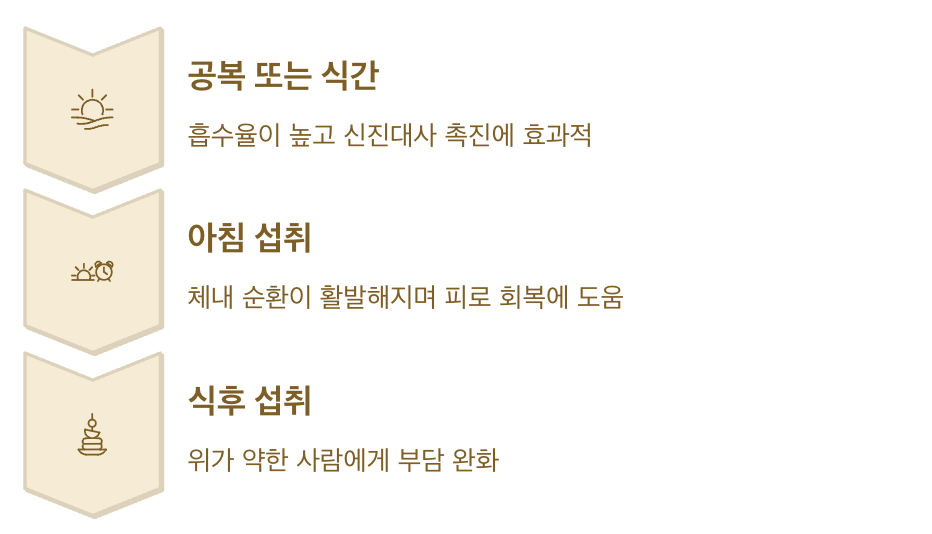 | 공복 또는 식간 | 흡수율이 높고 신진대사 촉진에 효과적 |