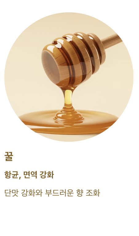 | 꿀 | 항균, 면역 강화 | 단맛 강화와 부드러운 향 조화 |