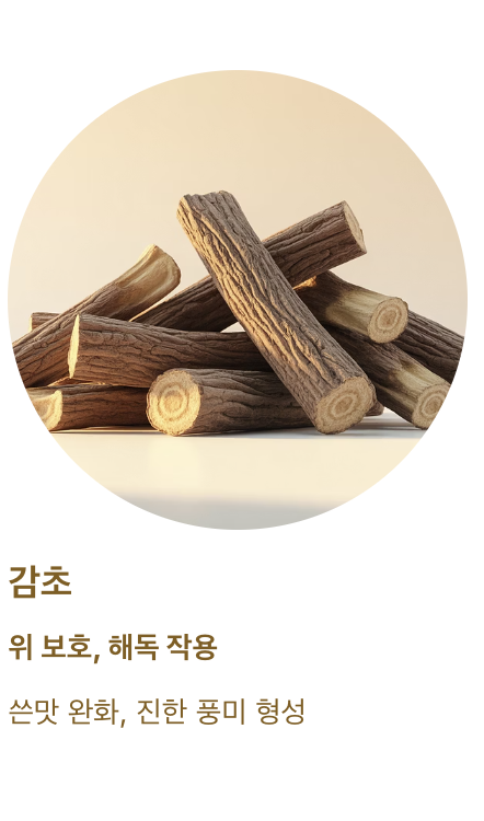 | 감초 | 위 보호, 해독 작용 | 쓴맛 완화, 진한 풍미 형성 |