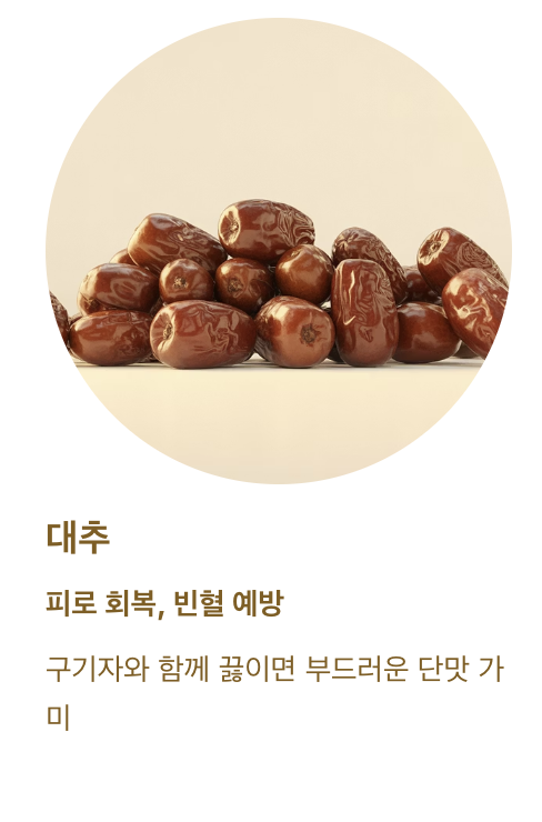 | 대추 | 피로 회복, 빈혈 예방 | 구기자와 함께 끓이면 부드러운 단맛 가미 |