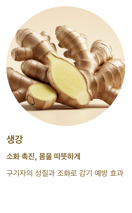 | 생강 | 소화 촉진, 몸을 따뜻하게 | 구기자의 성질과 조화로 감기 예방 효과 |