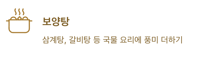 | 보양탕 | 삼계탕, 갈비탕 등 국물 요리에 풍미 더하기 |