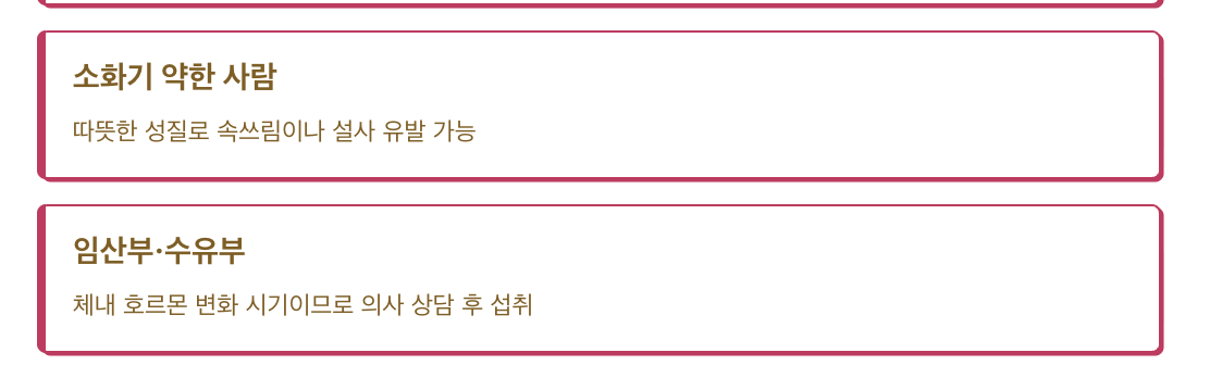 ✅ 소화기 약한 사람: 따뜻한 성질로 속쓰림이나 설사 유발 가능