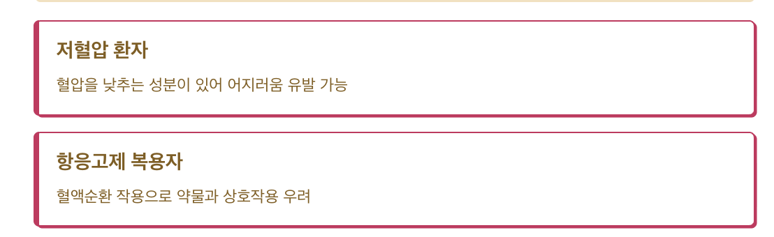 ✅ 저혈압 환자: 혈압을 낮추는 성분이 있어 어지러움 유발 가능