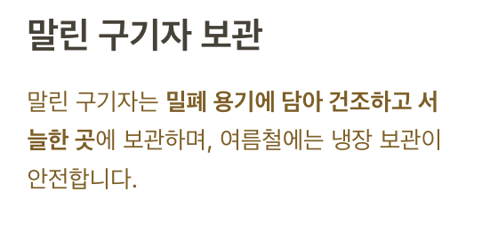 말린 구기자는 밀폐 용기에 담아 건조하고 서늘한 곳에 보관하며, 여름철에는 냉장 보관이 안전합니다.