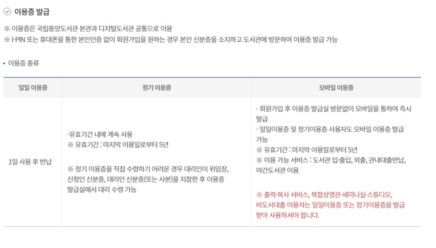 회원증은 도서 대출, 열람실 좌석 예약, 복사/출력 등 오프라인 서비스 이용 시 필요하므로