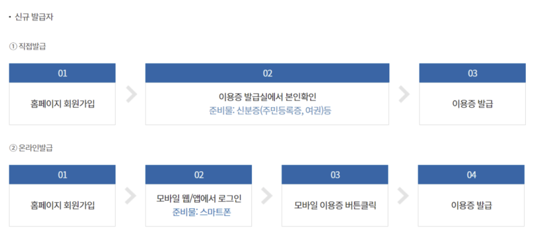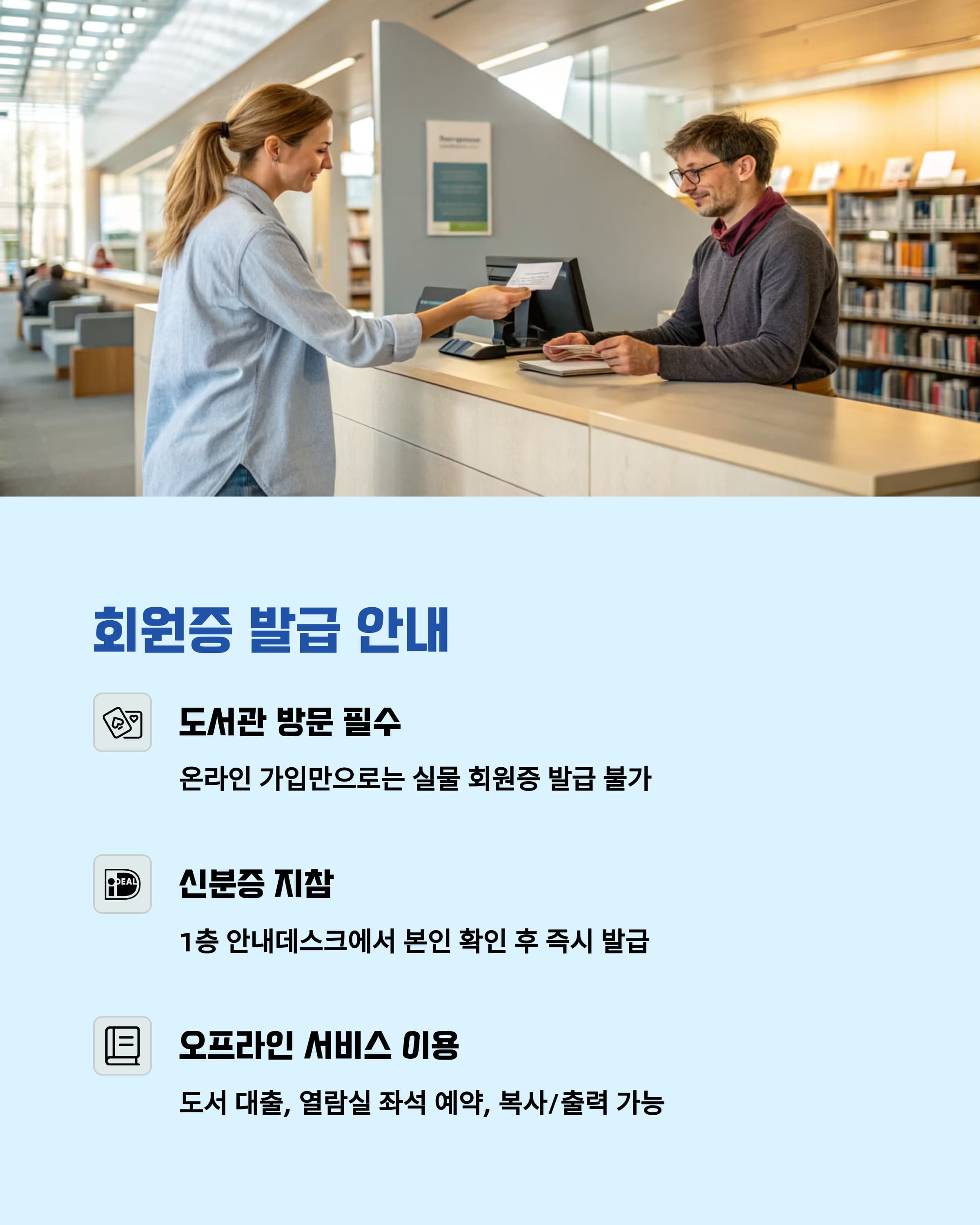 1층 안내데스크에서 신분증을 제시하면 회원증을 바로 발급받을 수 있습니다.