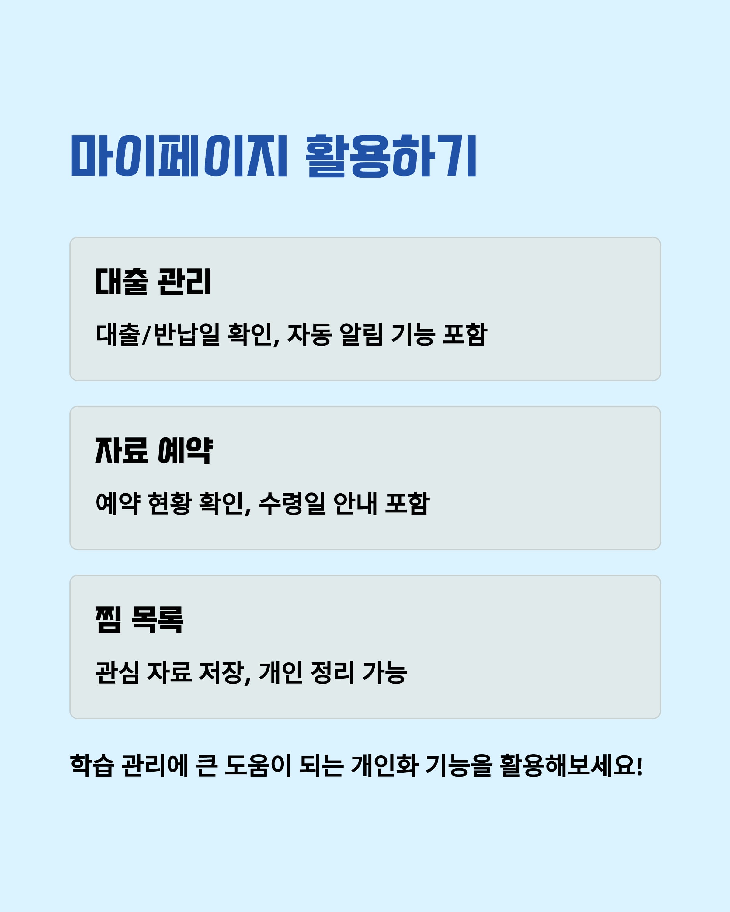 대출 내역, 반납 예정일, 예약 자료 상태 등을 한눈에 확인할 수 있습니다.