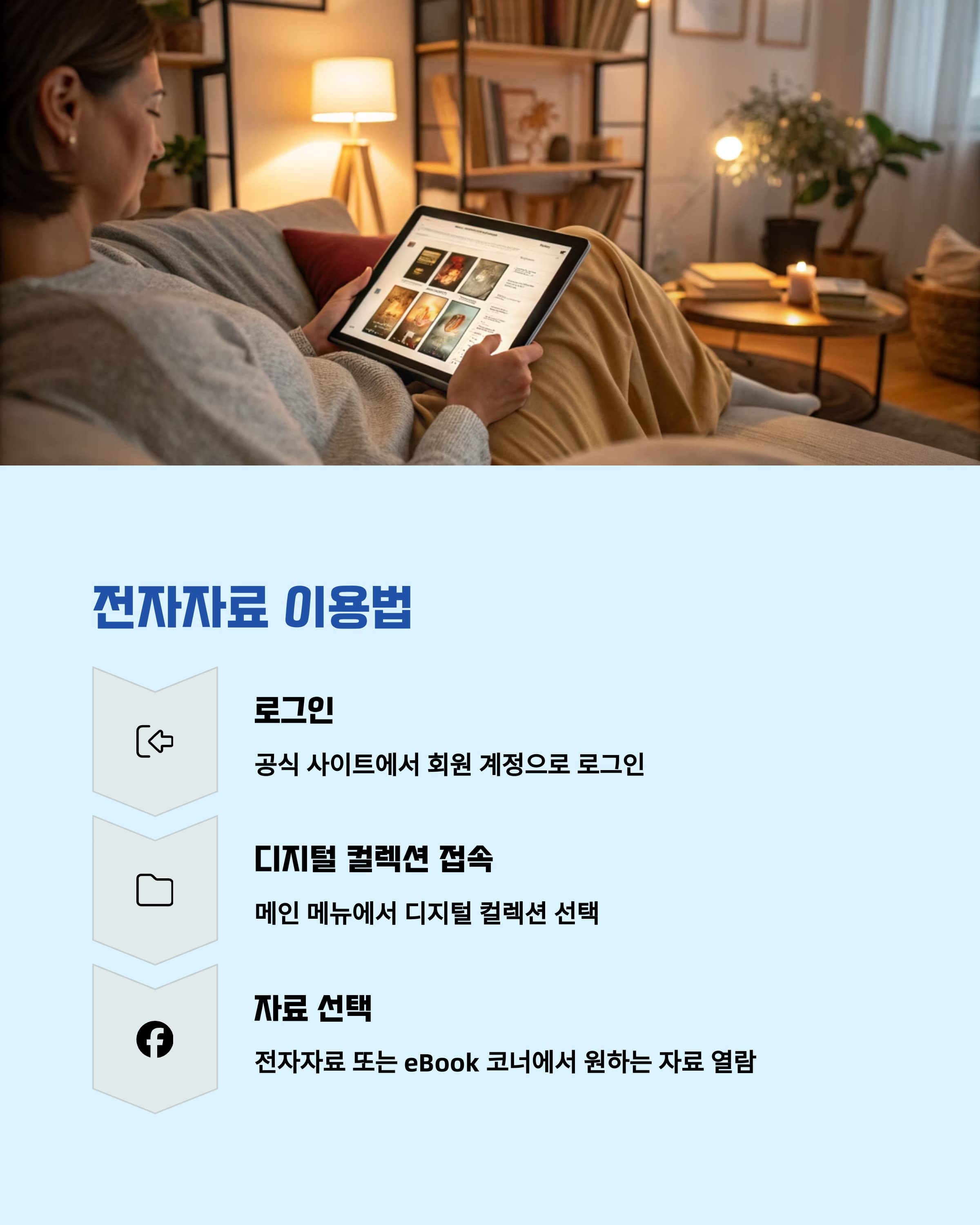 공식 사이트 → 로그인 → 디지털 컬렉션 → 전자자료 또는 eBook 코너 클릭