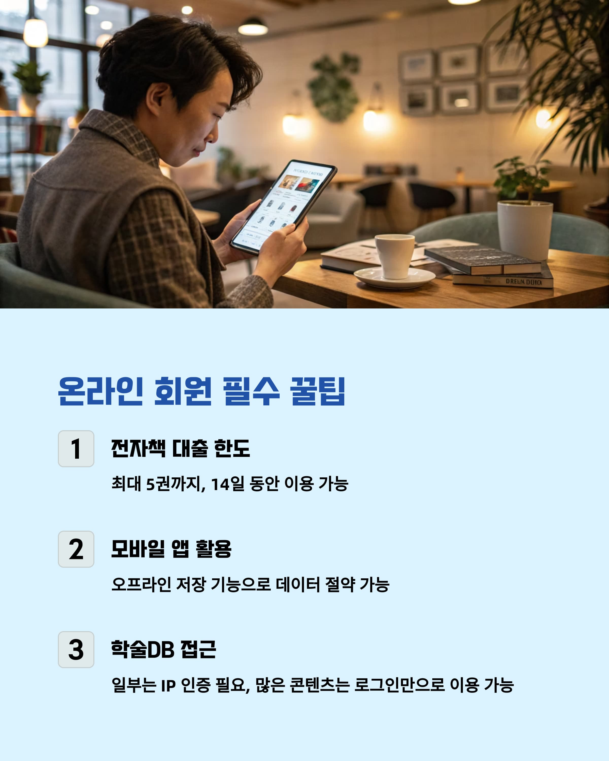 특히 온라인 회원가입을 하면 집에서도 전자책, 학술 자료 등 다양한 콘텐츠를 이용할 수 있습니다.