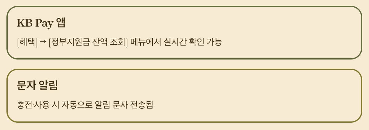 | KB Pay 앱 | [혜택] → [정부지원금 잔액 조회] 메뉴에서 실시간 확인 가능 |