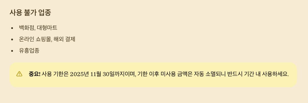 기한 이후 미사용 금액은 자동 소멸되니 반드시 기간 내 사용하세요.