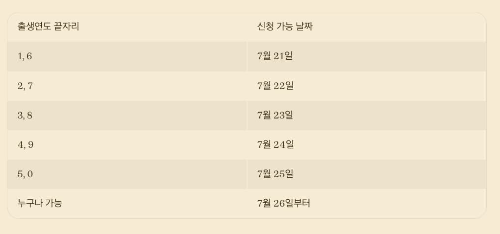신청 첫 주는 생년 끝자리에 따라 요일제가 적용되므로 아래 표를 참고하세요.