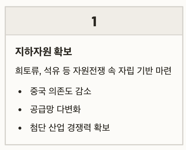 - 지하자원 확보 – 희토류, 석유 등 자원전쟁 속 자립 기반 마련