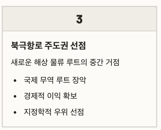 - 군사적 요충지 확보 – ICBM 조기 탐지와 북극 방어망 강화