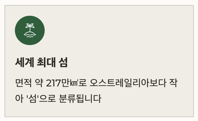 그린란드는 세계에서 가장 큰 섬이지만, 오스트레일리아보다 작아 ‘섬’으로 분류됩니다.