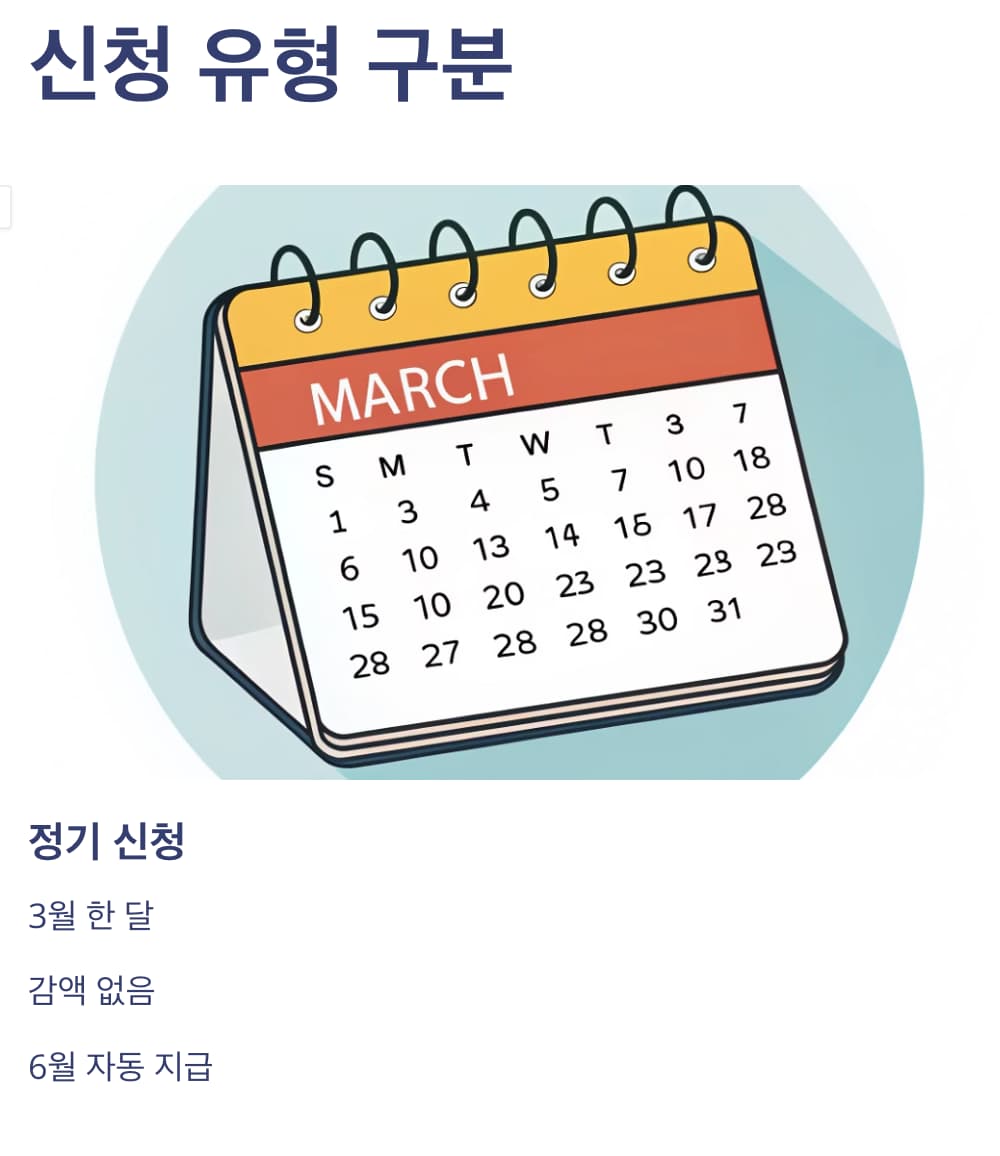 | 정기 신청 | 3월 한 달 | 없음 | 자동으로 6월 지급 |