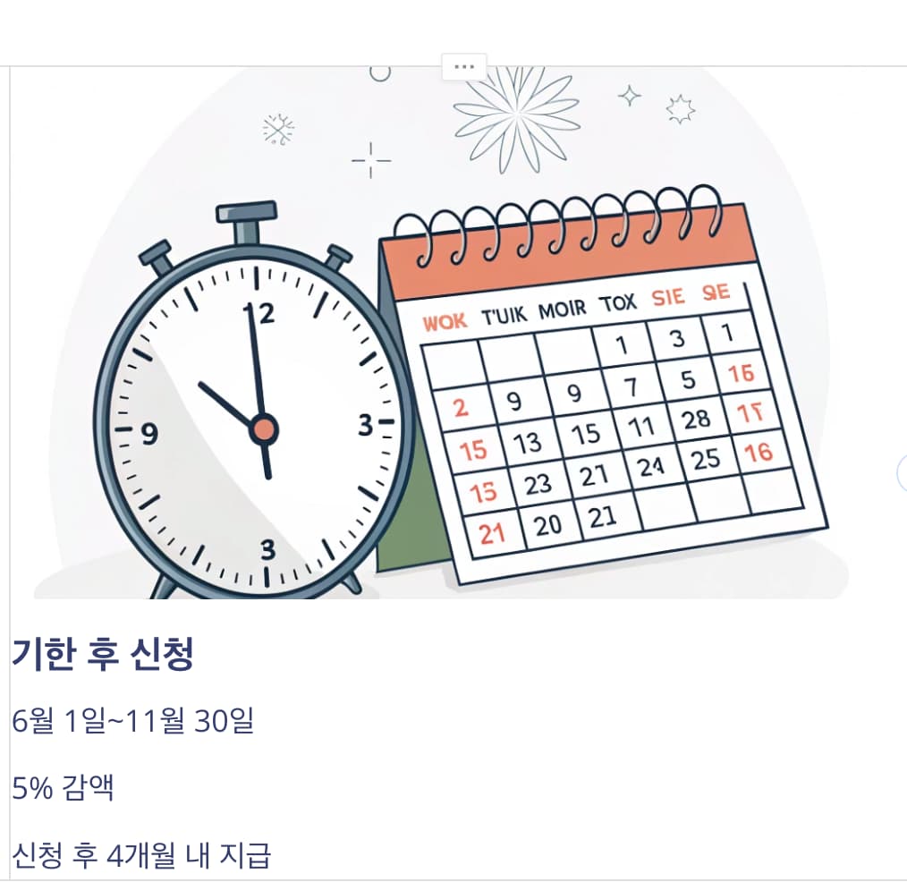 | 기한 후 신청 | 6월 1일 ~ 11월 30일 | 5% 감액 | 신청일로부터 4개월 이내 지급 |